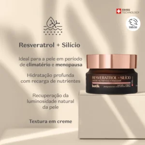 Botik is de beste bondgenoot van een vrouw in elke levensfase : de Resveratrol & Silicium Verstevigende Crème is speciaal ontwikkeld voor de huid tijdens de menopauze en overgang . Dankzij de antioxiderende werking vermindert het vrije radicalen en herstelt het de natuurlijke glans van de huid.